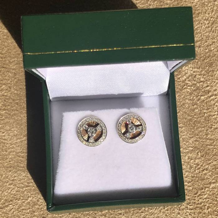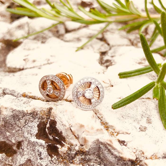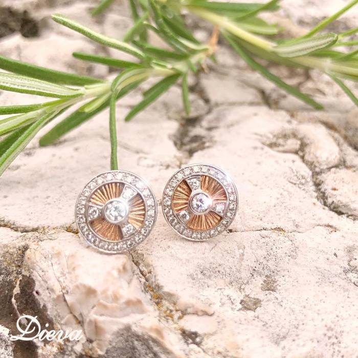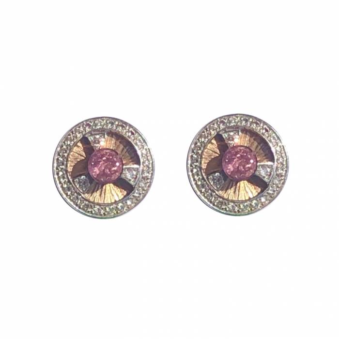 Crafted in precious 18 k rose and white gold these stud earrings are set with 56 sparkling, round-cut natural diamonds G-VS