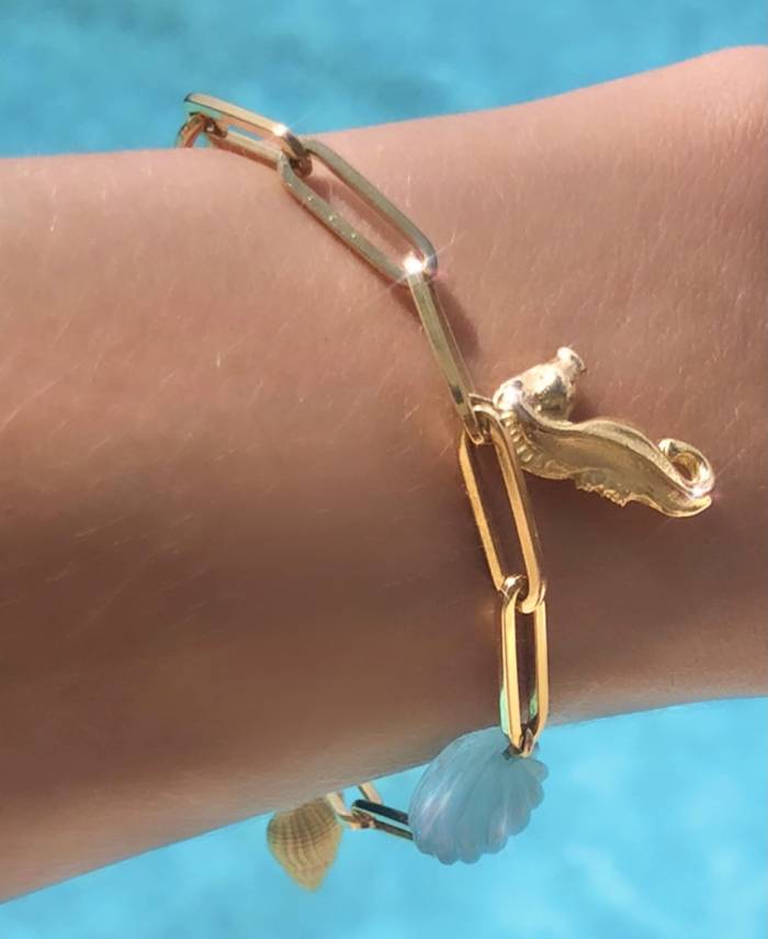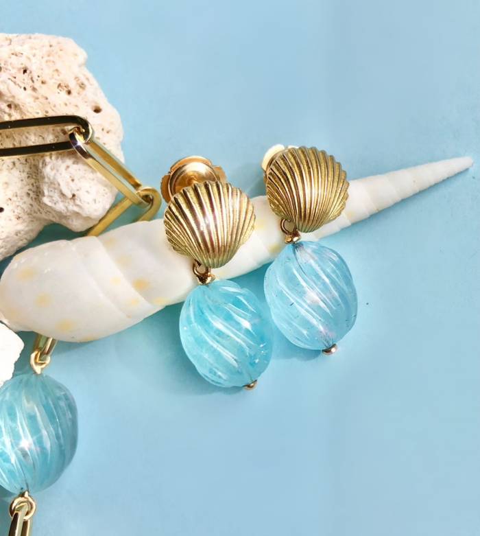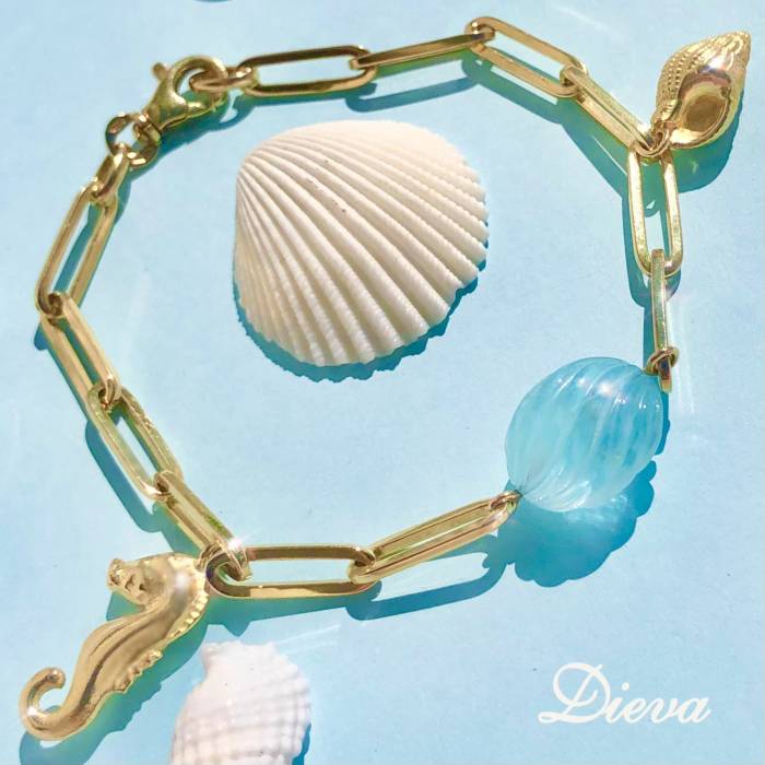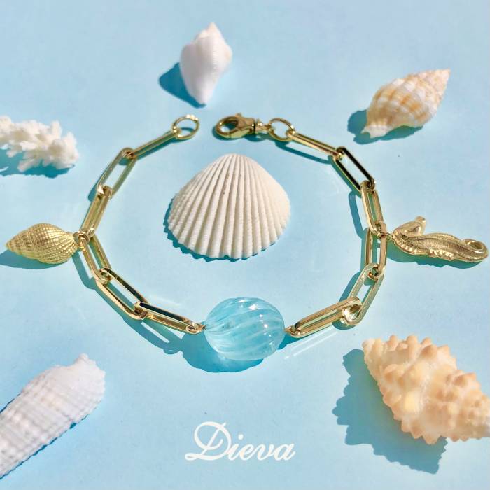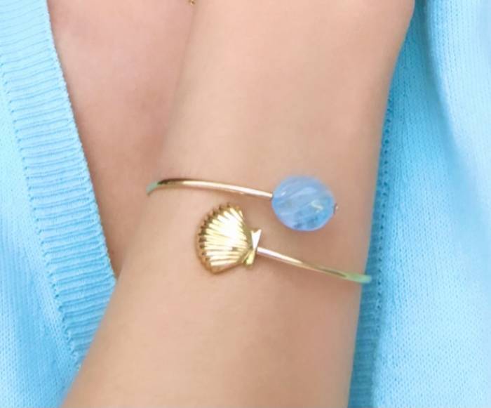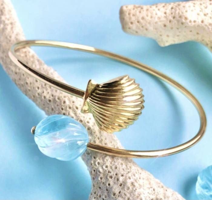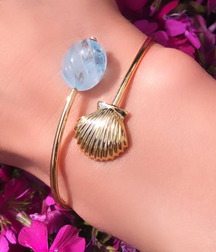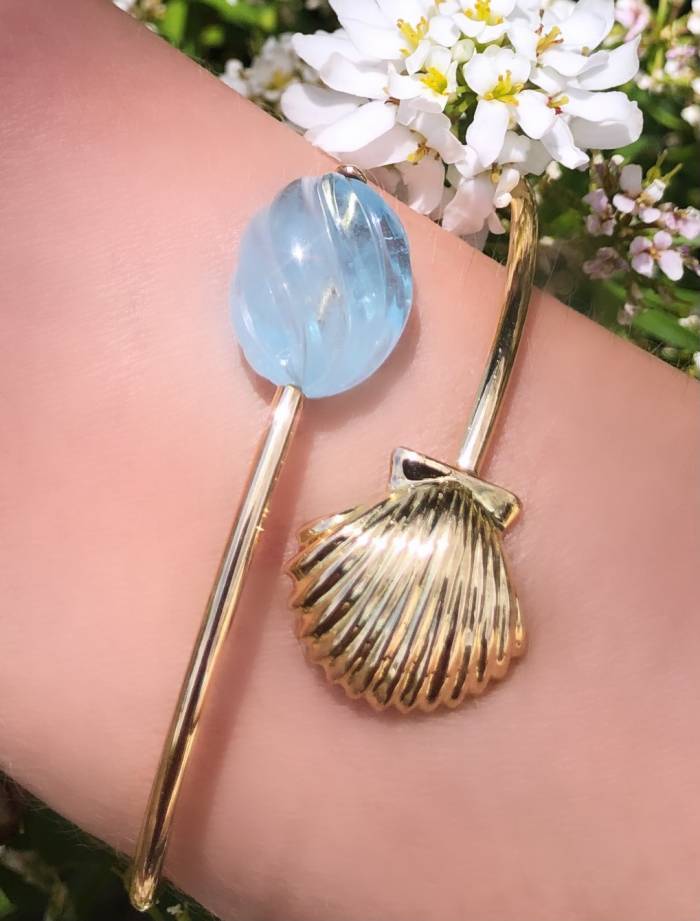 Seashell bracelet in yellow gold 18 k and hand carved Sky Blue Topaz