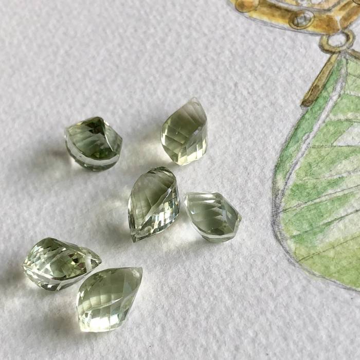 Tailored rose gold 18 k earrings with diamonds and hand carved delicate green Prasiolite gemstone (also known as green amethyst) detachable drops. You can wear them as stud earrings or as a drop earrings