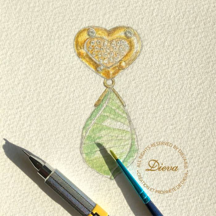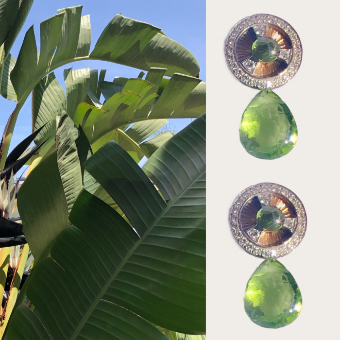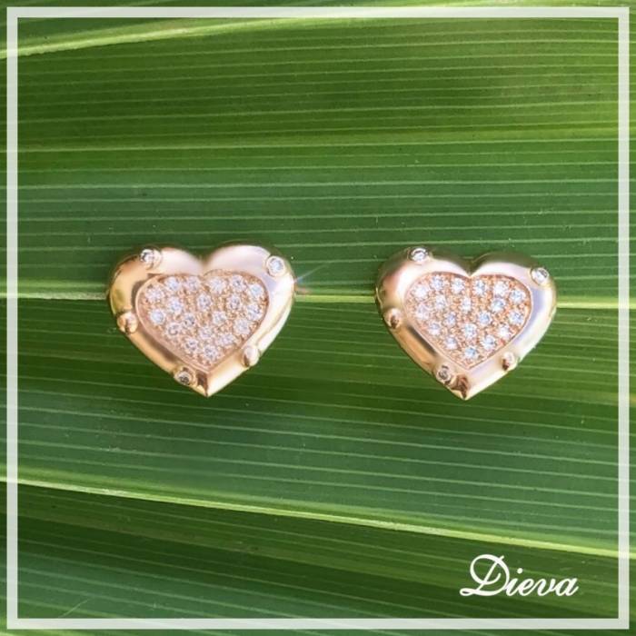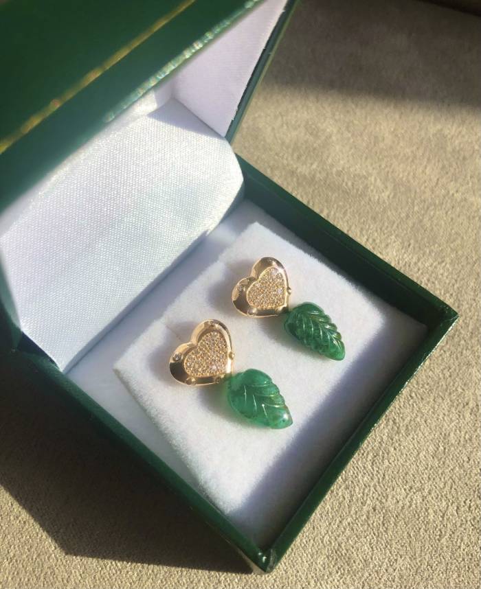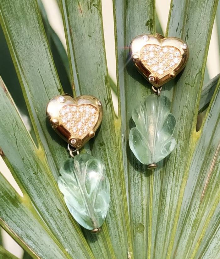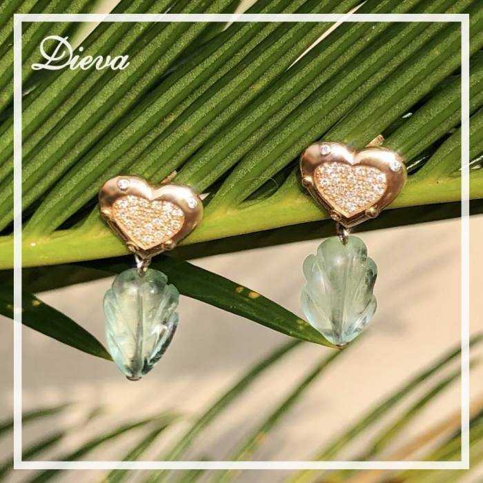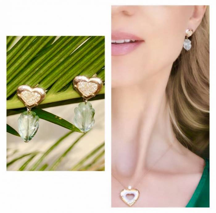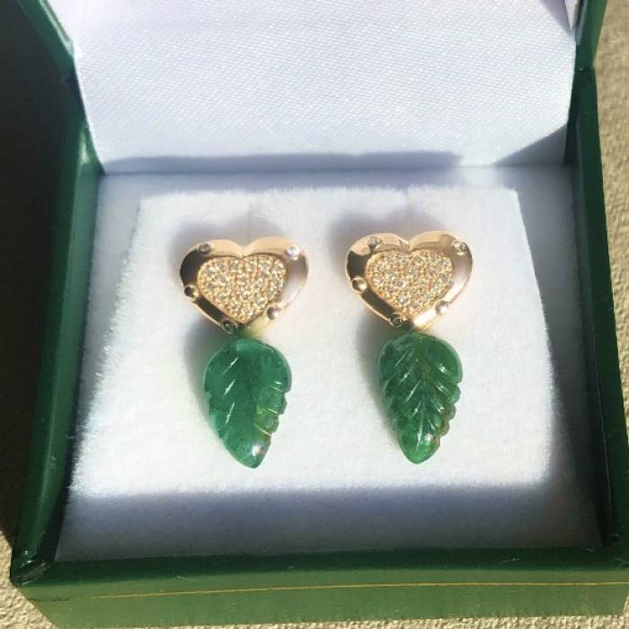 Diamond heart earrings in precious rose gold 18 k and detachable hand carved leaves of natural emerald