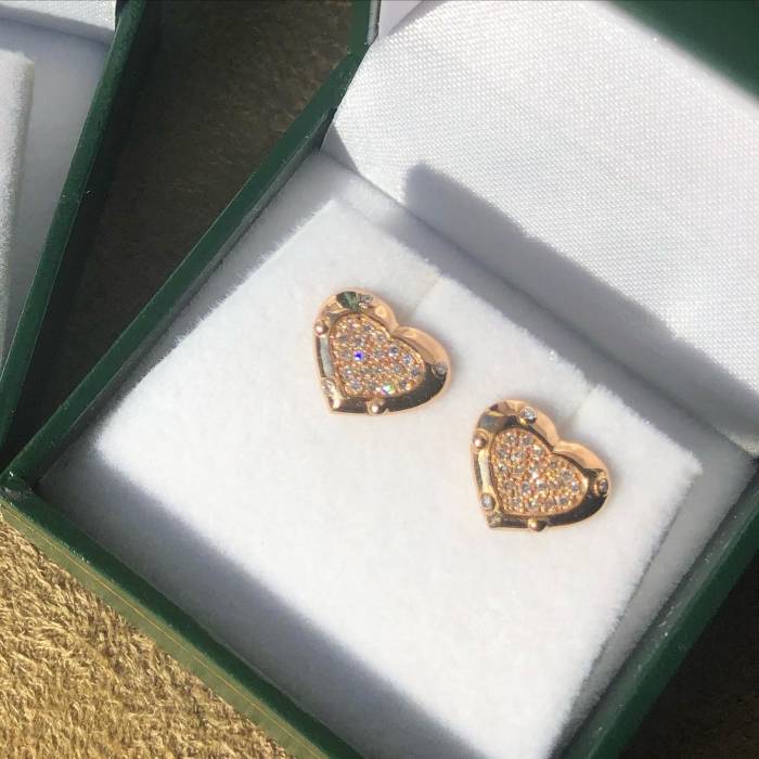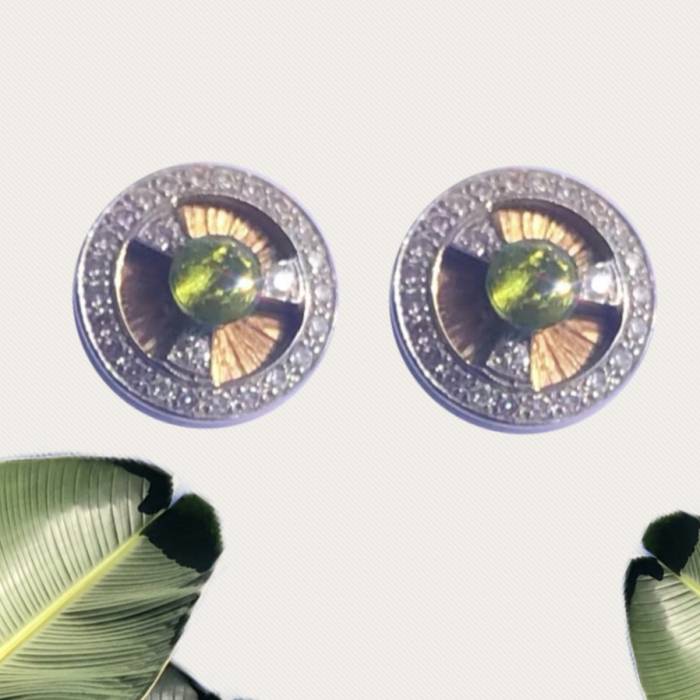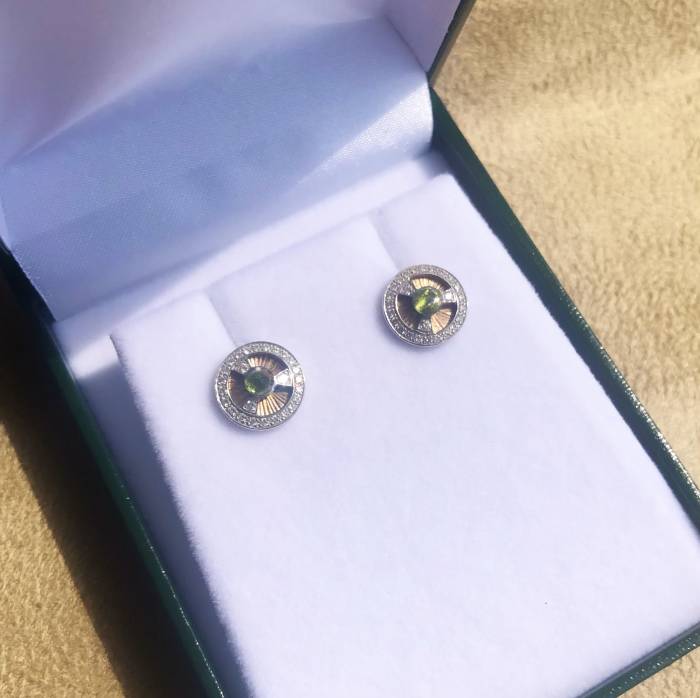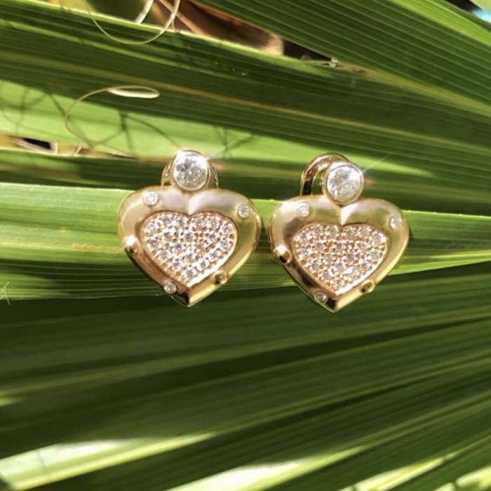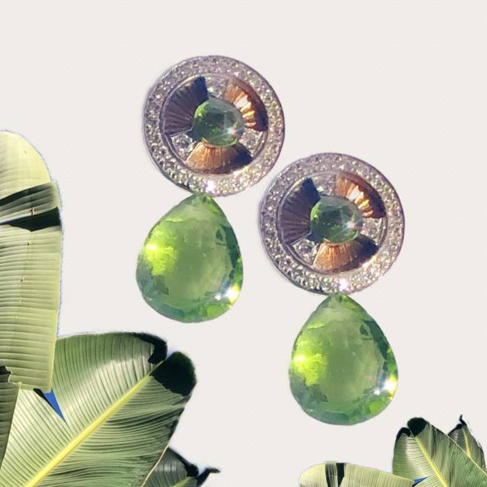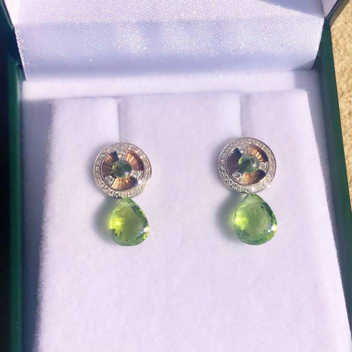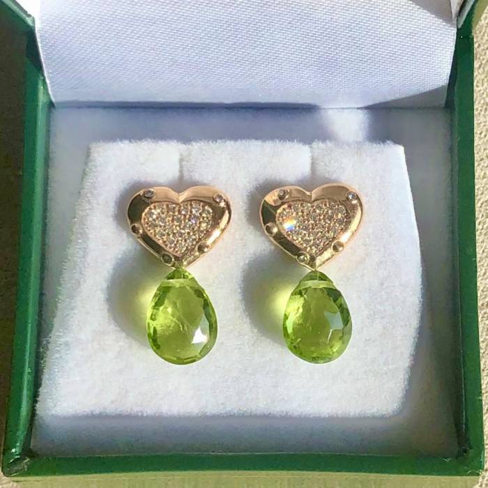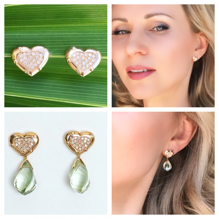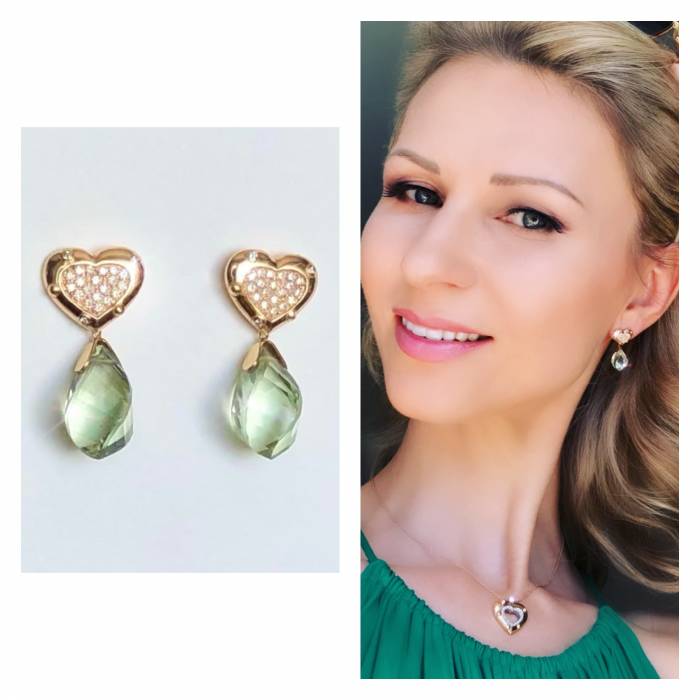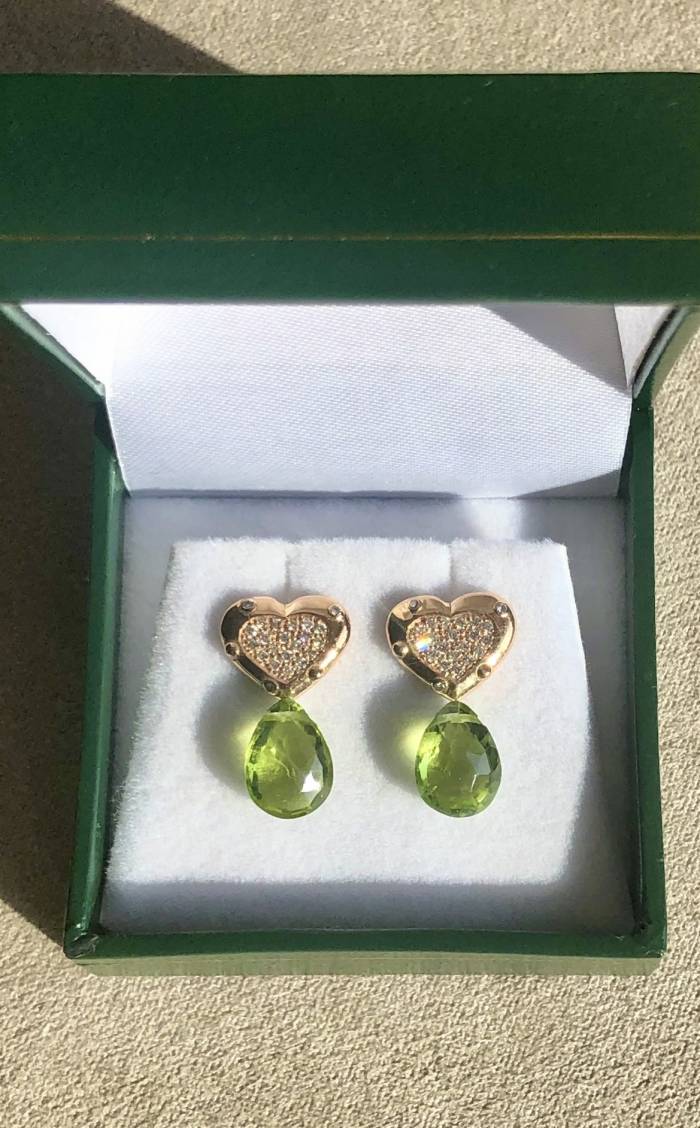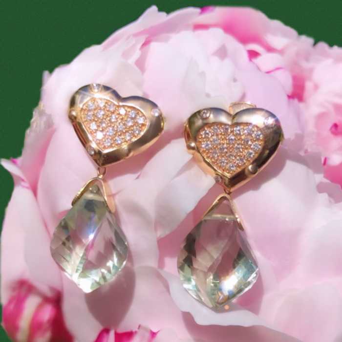 Diamond heart earrings made in precious 18 K rose gold and detachable sand carved Peridot drops