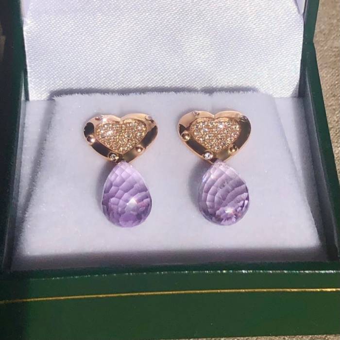 Tailored rose gold 18k earrings set with diamonds and detachable drops of hand carved natural Amethyst. Color of gemstone : deep purple.