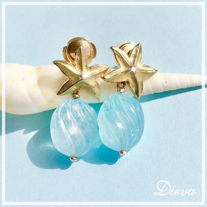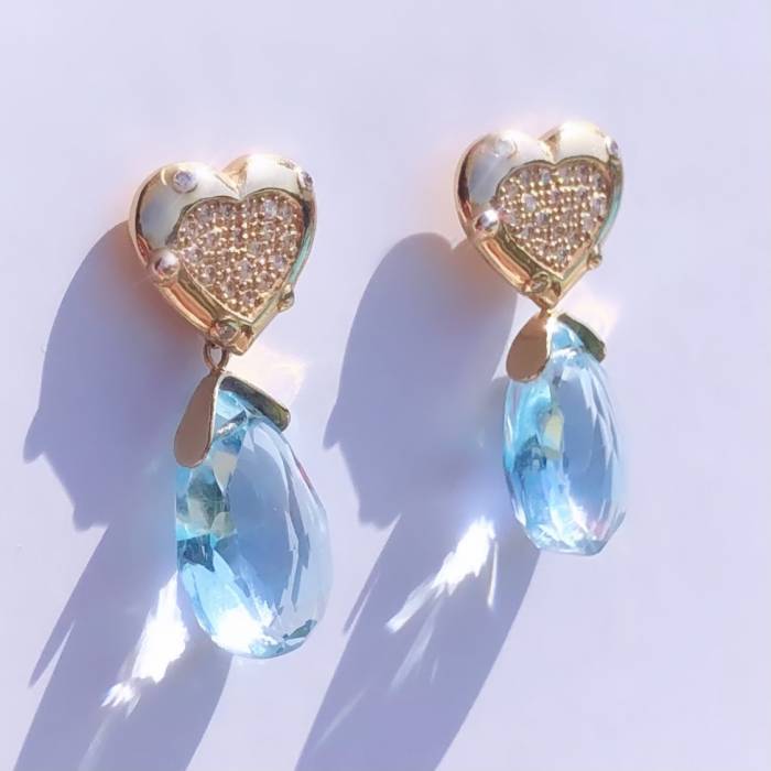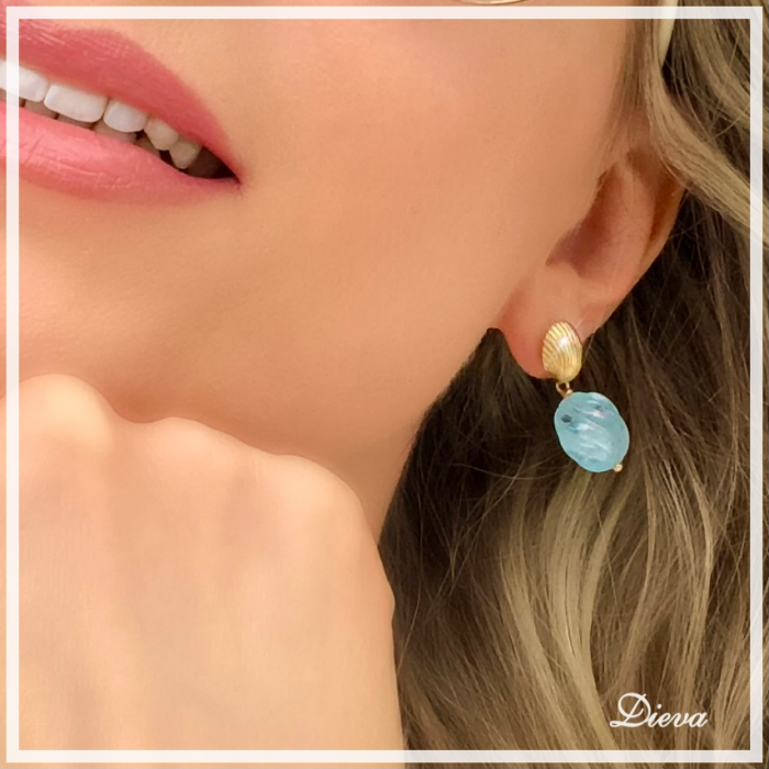 Earrings in precious yellow gold 18 k and hand carved Sky Blue Topaz