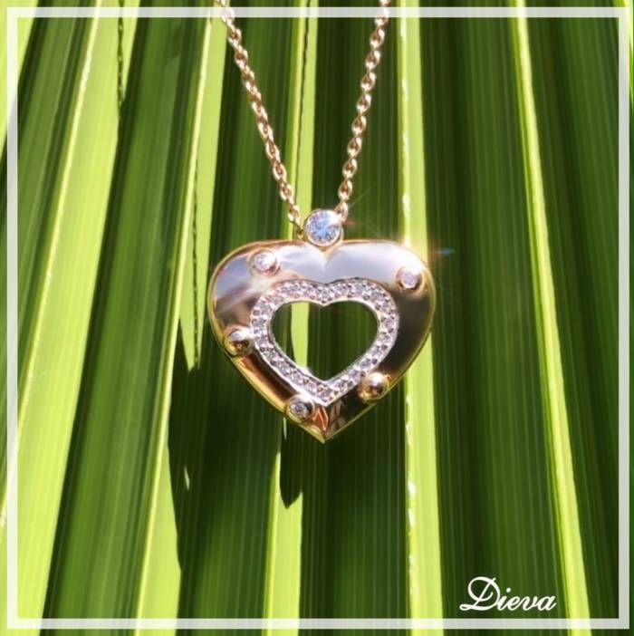 Dieva heart shaped pendant hand crafted in rose and white gold 18k, set with high quality natural white diamonds GV-S and fine quality cornflower blue sapphire from Ceylon