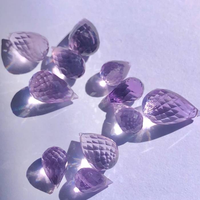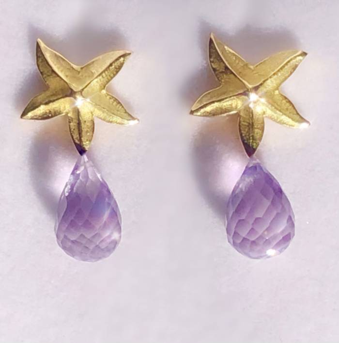 Earrings in precious yellow gold 18k and detachable hand carved drops of natural Lavender Amethyst