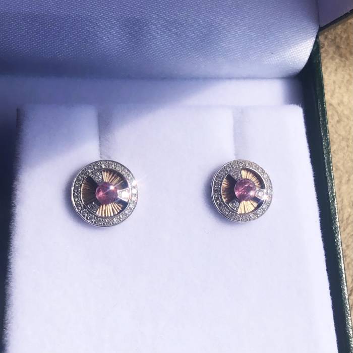 Earrings and pendant made in rose gold 18k, set with natural white diamonds GV-S and Ceylon Fine quality Pink Sapphires