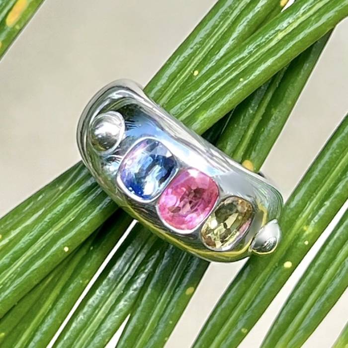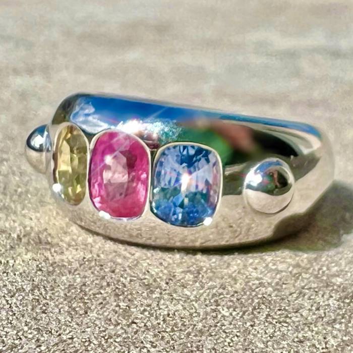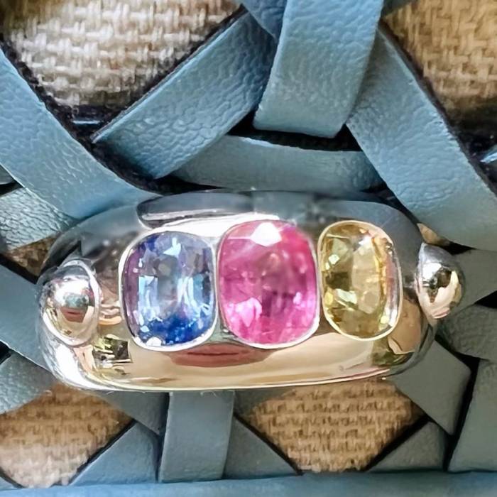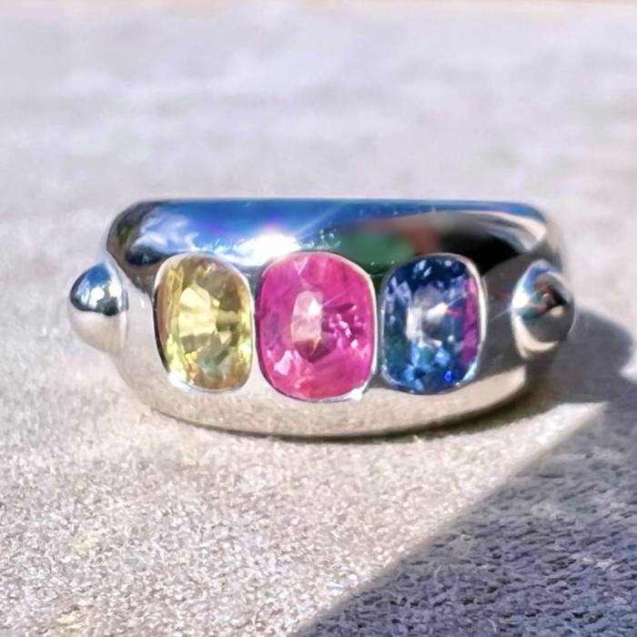 Dieva Ring handcrafted in precious white gold 18k and set with finest quality 3 sapphires from Ceylon in yellow, pink and cornflower blue colours